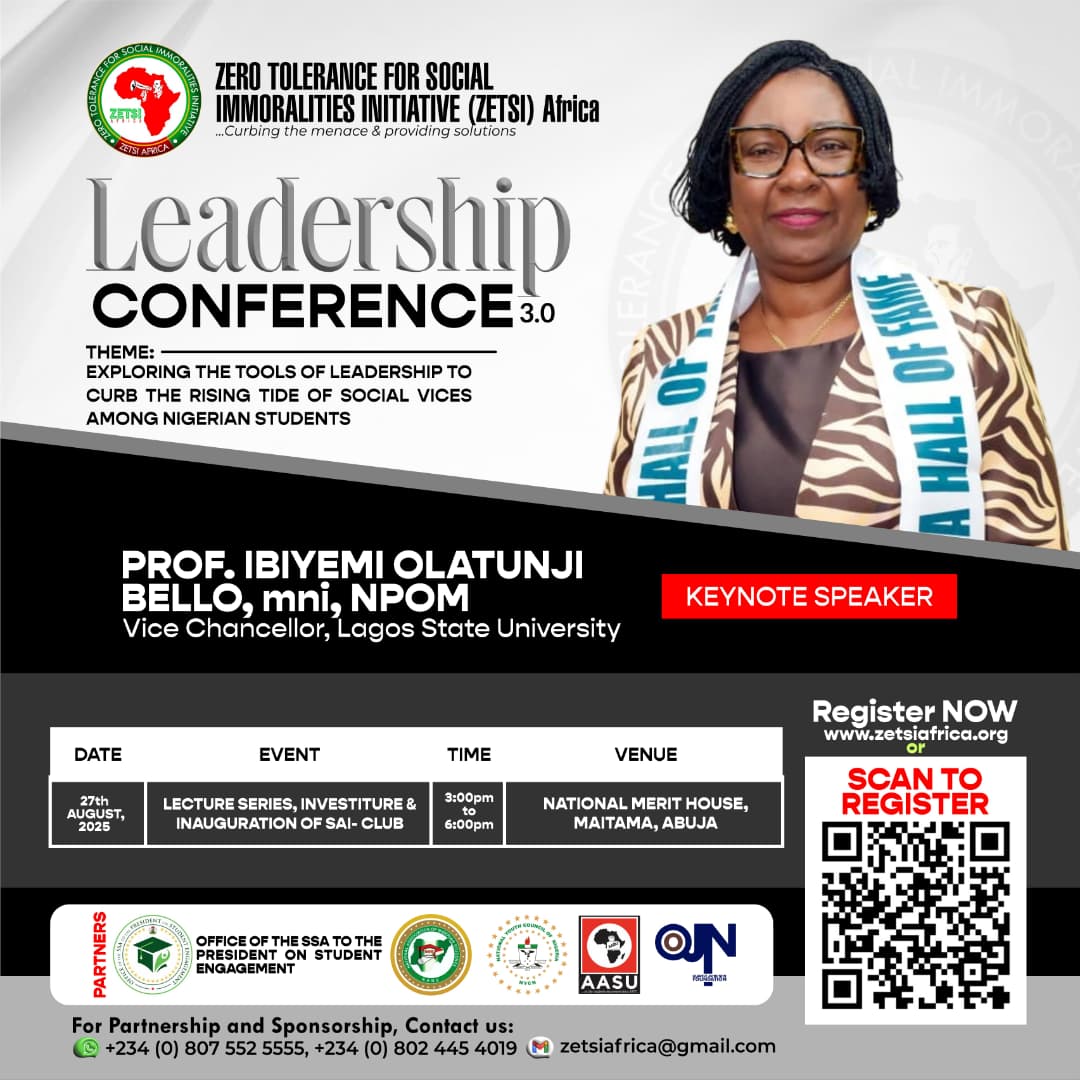 Abuja, Nigeria — August 19th, 2025 — The Zero Tolerance for Social Immoralities Initiative (ZETSI Africa), in collaboration with leading youth and student organizations, has announced the line-up of distinguished speakers for its highly anticipated Leadership Conference 3.0. The event will take place from August 26th to 28th, 2025, at the University of Abuja and the National Merit House, Maitama, Abuja.