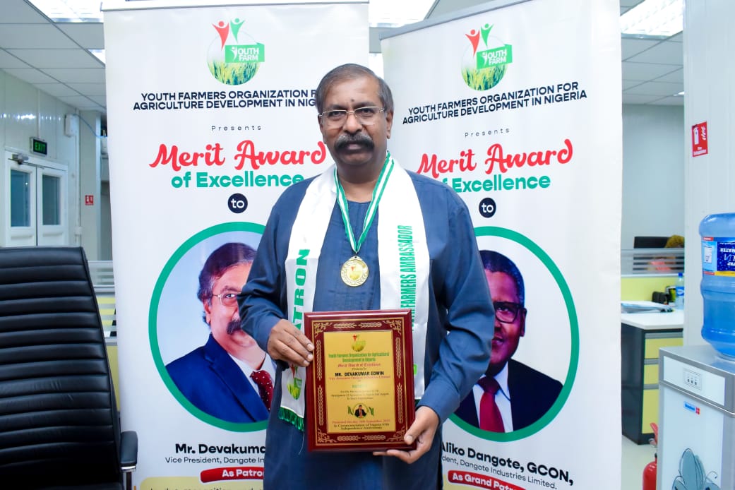 The Youth Farmers Organization for Agricultural Development in Nigeria has honoured Africa’s richest man, Alhaji Aliko Dangote, and the Vice President of Dangote Industries Limited, Mr. Devakumar Edwin, with Merit Awards of Excellence for their outstanding roles in national development and youth empowerment.